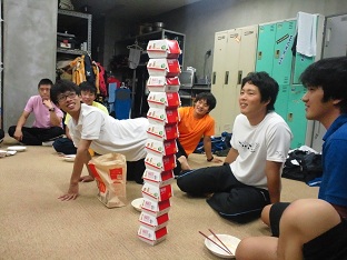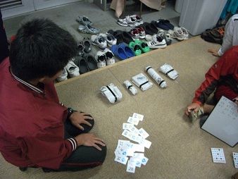 新人戦の練習はかなりハードで、土曜、日曜の朝から夕方まで練習する「1日練」では 昼食後の休憩時間に部室で寝てる部員が多数を占めました。 一方で楽しいイベントもありました。ハロウィンパーティーではビンゴゲームをしました。 景品はヒミツです。