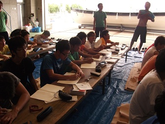 午前の3時間は3回生による授業、午後は授業に基づいて実際にカッターを動かす実習、