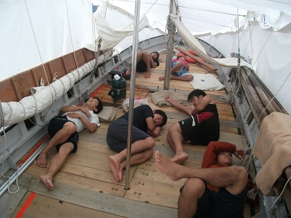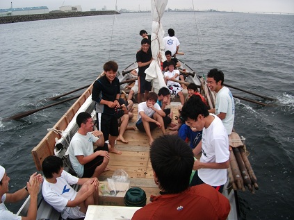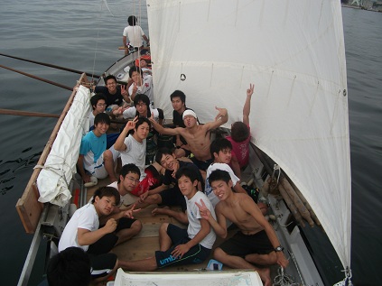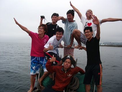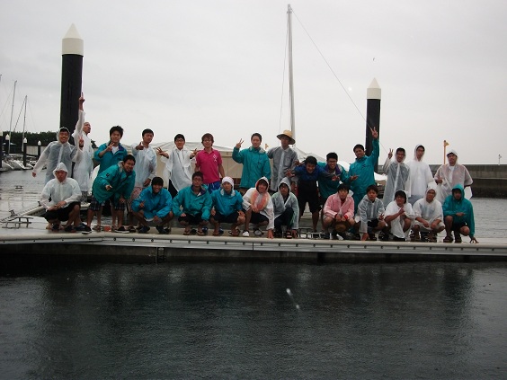 雨が降ったり止んだりで帆を張れませんが、艇の上は 59期の記念写真!