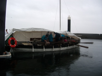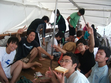 雨天での作業は少し大変です。 朝食は海の上でパン。